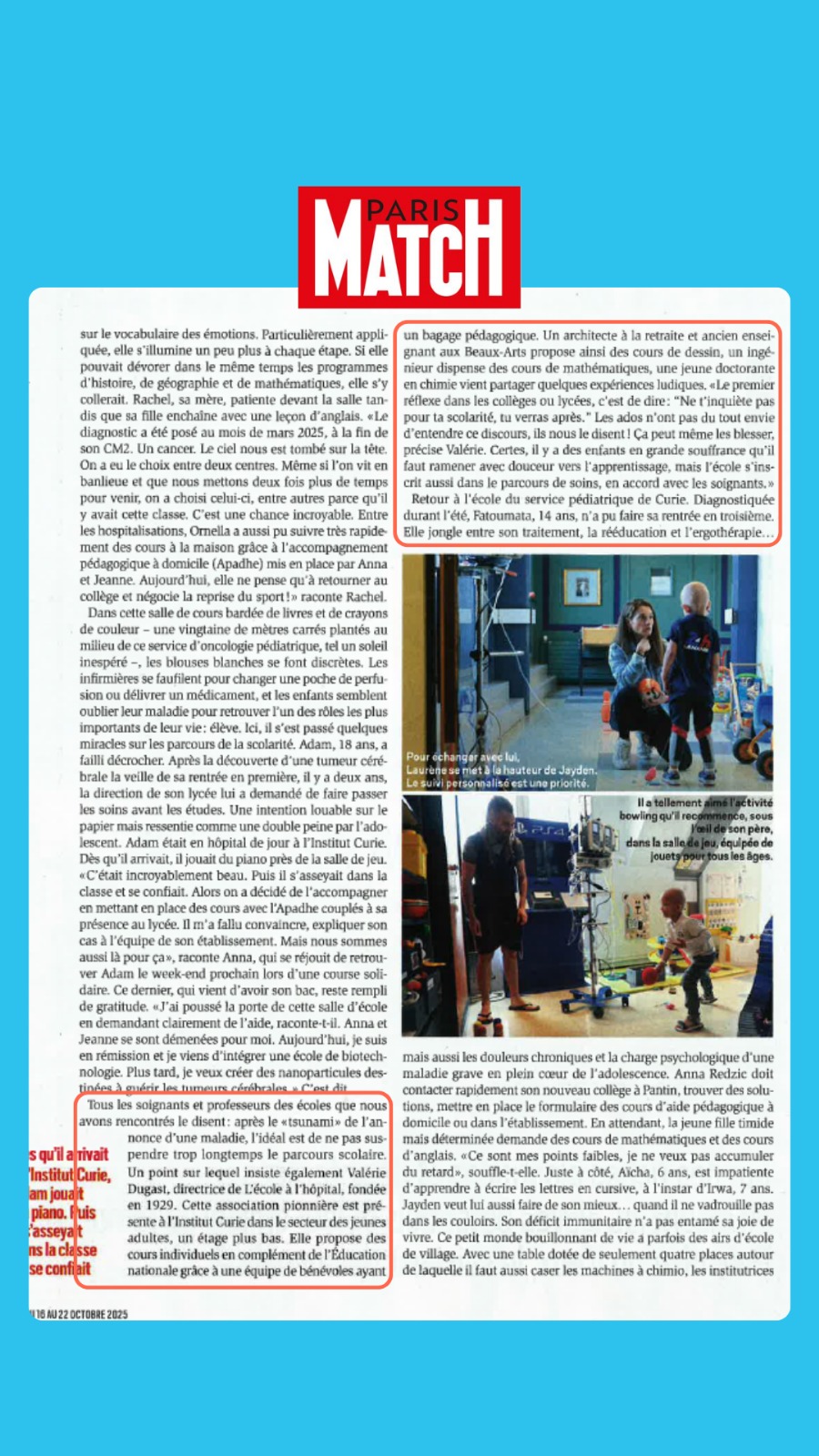 LEÇON DE VIE - Reportage en immersion au sein de l'Institut Curie où la rédaction de Paris Match revient sur les rôles respectifs des enseignants de l'Education Nationale et de l'association l'Ecole à l'Hôpital, au travers du témoignage de Valérie Dugast, sa Directrice Générale.